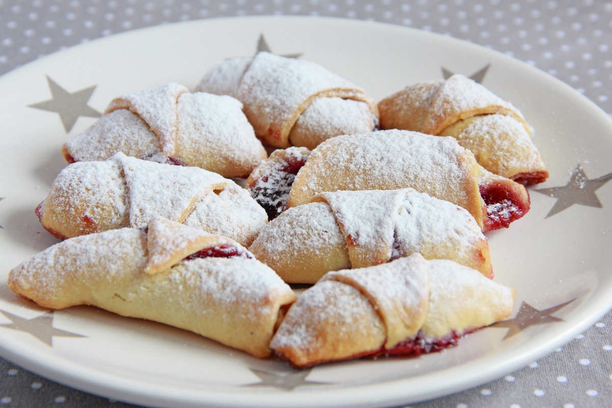 A sodrófa segítségével az egyes tésztarészeket sorra sodorjuk 3-4 mm vastag, kör alakú lapokká. Mindegyik tésztalapot háromszög alakúra vágjuk. Adjunk hozzá egy teáskanál lekvárt vagy egy darab szart a háromszögek tövéhez. Ezután a háromszögeket az alaptól kezdve a tetejéig tekerjük. Az így kialakult krumplit a tepsibe helyezzük, amibe sütőpapírt tettünk.