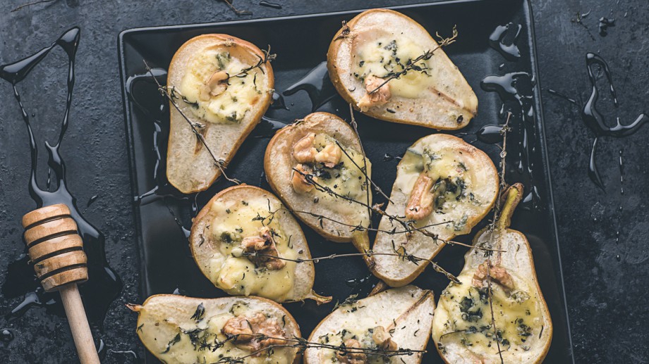 Ezután szedjük ki egy tányérra a körtefeleket, és a középső mélyedésbe tegyünk egy-egy kanál kéksajtot.