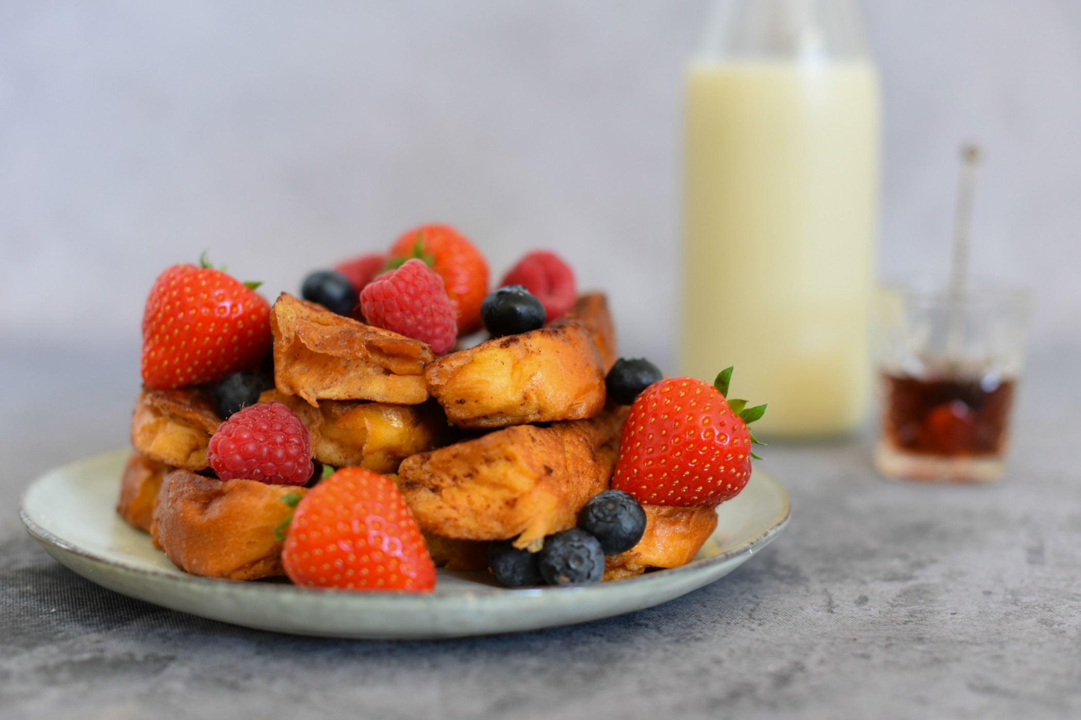 - Osszuk el a francia pirítós rudakat a tányérok között, díszítsük ízlés szerint friss eperrel, málnával, áfonyával és juharsziruppal. Azonnal tálaljuk!