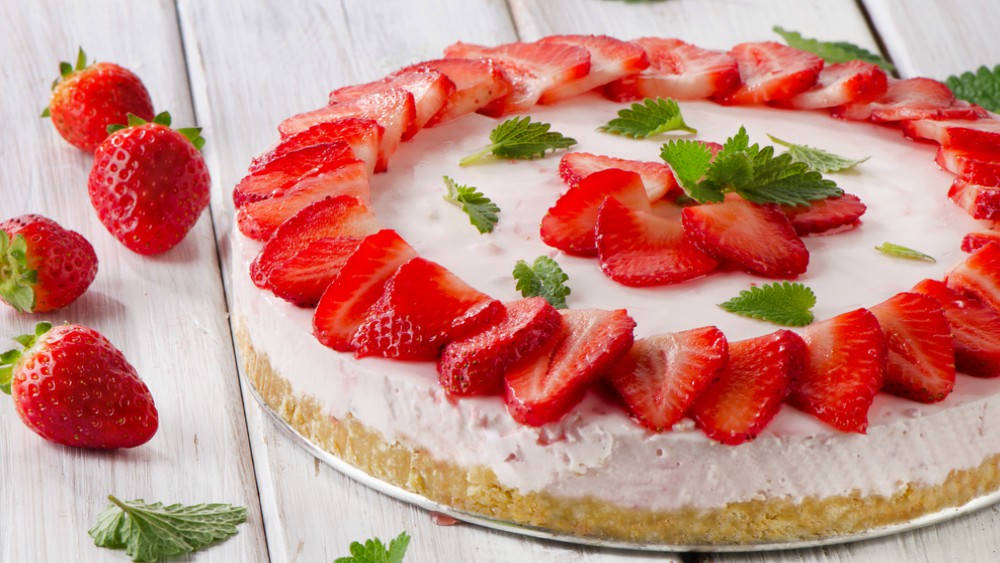 • A maradék epret szeletekre vágjuk, és a tortára helyezzük.