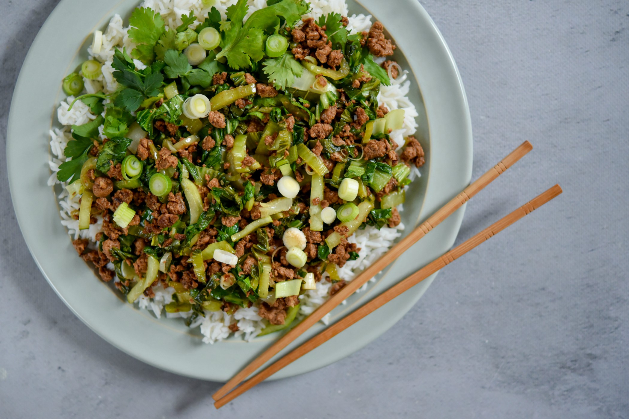 A Nemzeti Húsmentes Hét során minden holland embert arra várnak, hogy egy hetet töltsenek azzal, hogy felfedezzék, milyen ízletesek lehetnek a vegetáriánus ételek. Próbálja ki ezt a receptet keleti ropogós darált húshoz pak choi-val és basmati rizzsel.