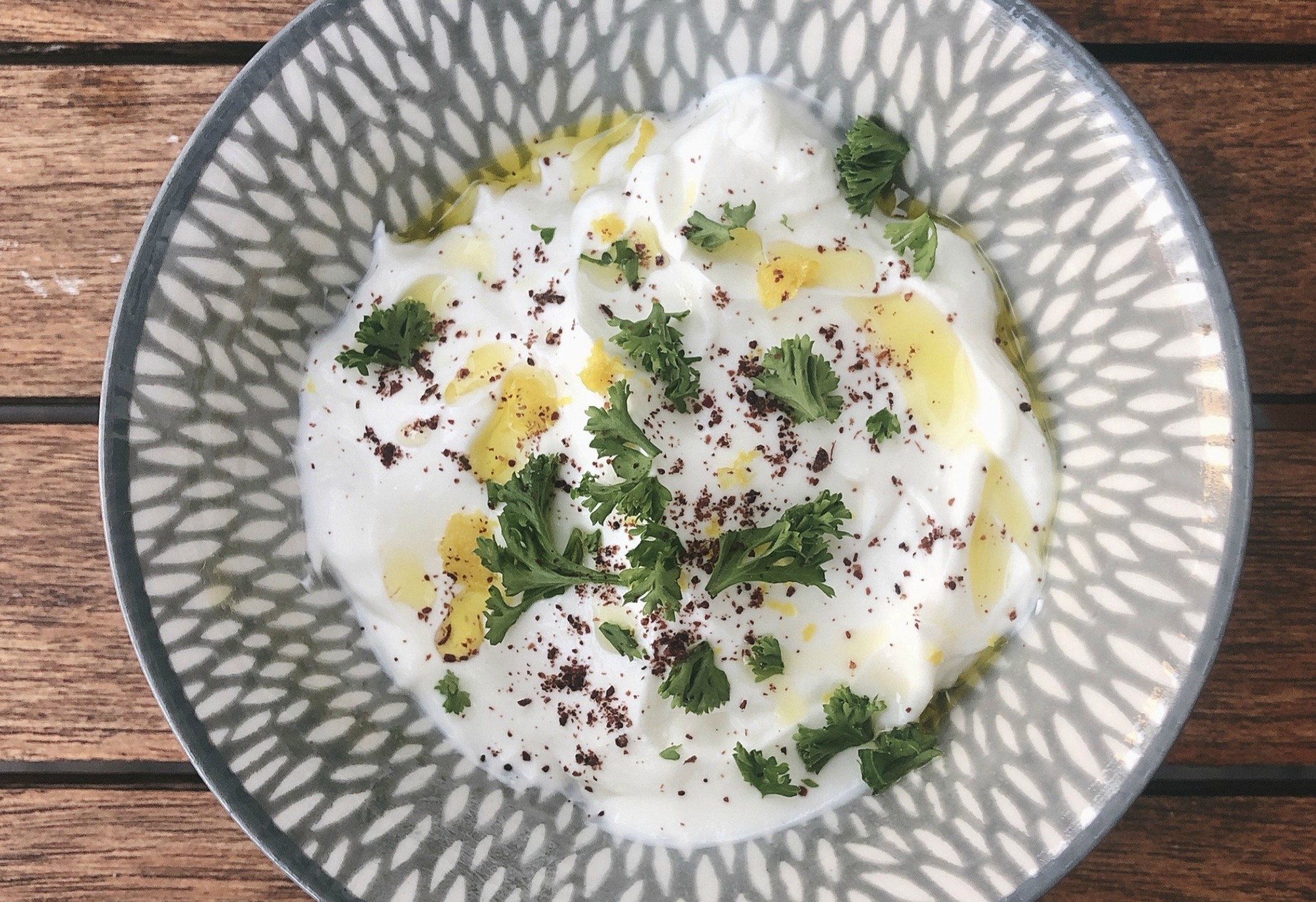 3. A labneh-t kanalazzuk egy tálba, és díszítsük citromhéjjal, petrezselyemmel és za’atarral. Egy csepp olívaolajjal fejezzük be.