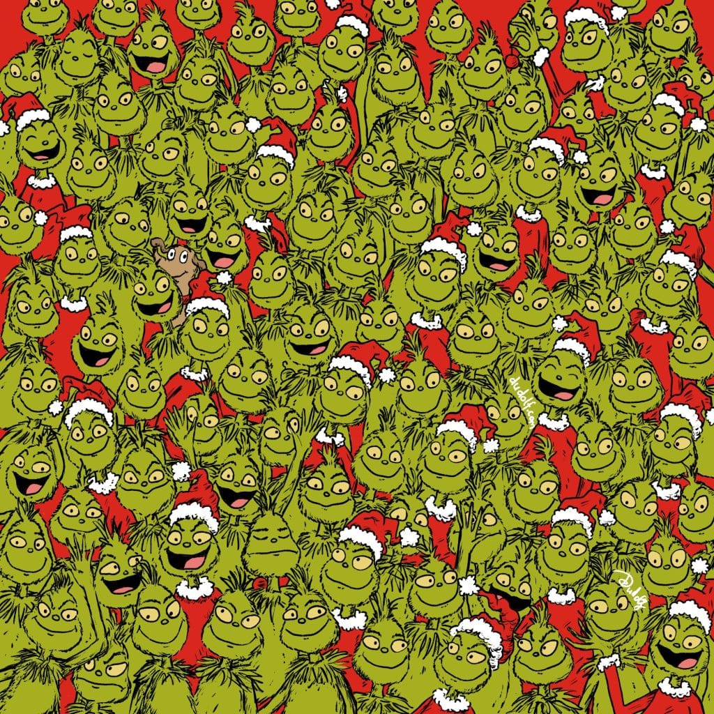 Dudás Gergely, aki szintén Dudolf, a Facebookon a következő felirattal osztotta meg a rejtvényt: „Megtalálod az 5 golyós díszt a Grincsek között?” A képen Mikulás sapkát viselő grincsek láthatók, akik élvezik egymás társaságát. Közöttük öt gömbdísz van elrejtve, és mindössze öt másodperced van mindet megtalálni. A te időd most kezdődik…
