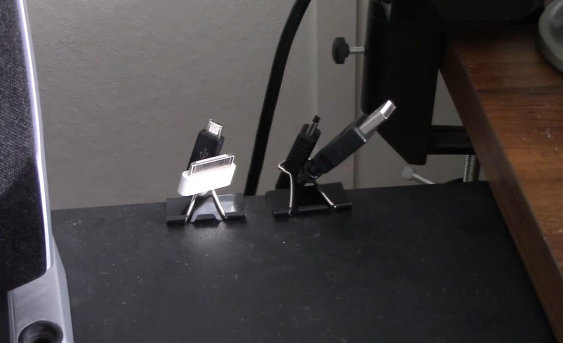Rögzítse a kapcsokat a munkalap széléhez, majd fűzze át a kábelt a fém részen. A hegyük nekitámaszkodik, így nem esik le könnyen az asztalról és nem gabalyodik össze másokkal.