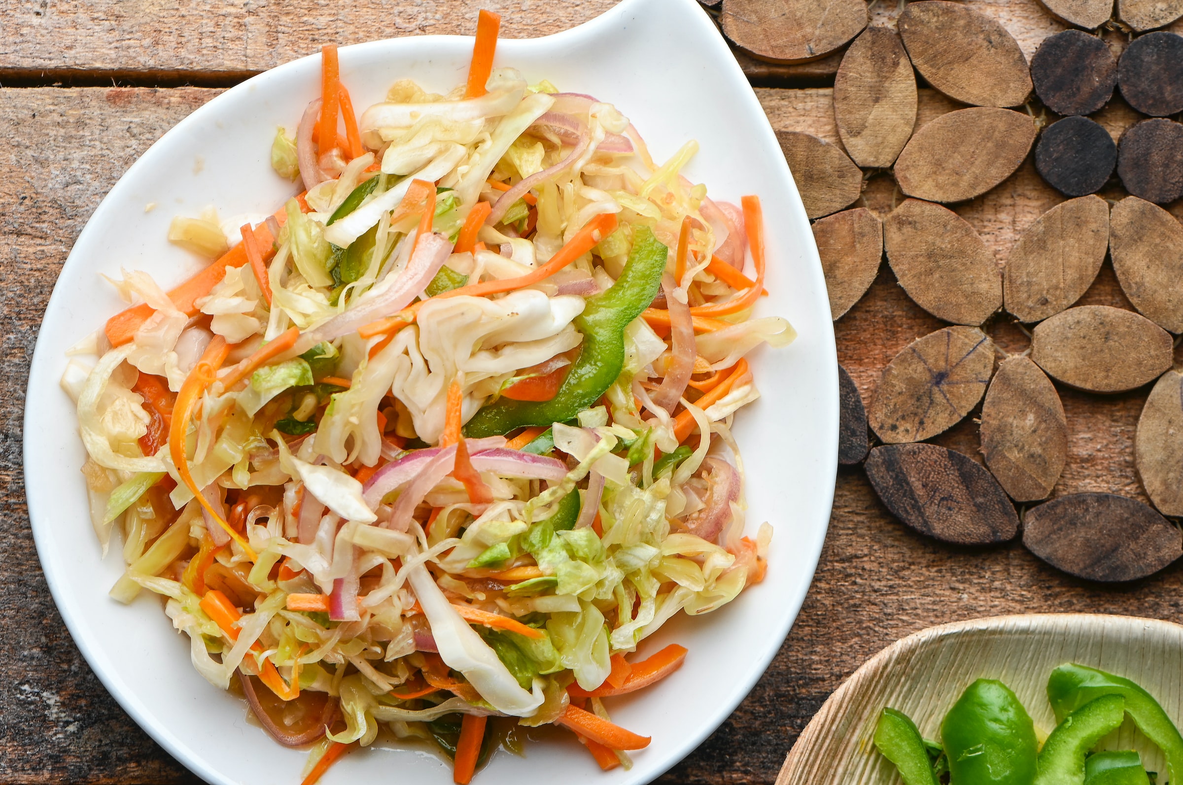 A káposztát apróra vágjuk, a sárgarépát reszelőn (nagyon) lereszeljük. Keverjük össze a káposztát és a sárgarépát egy nagy tálban, de ügyeljünk arra, hogy ne engedjen levet.