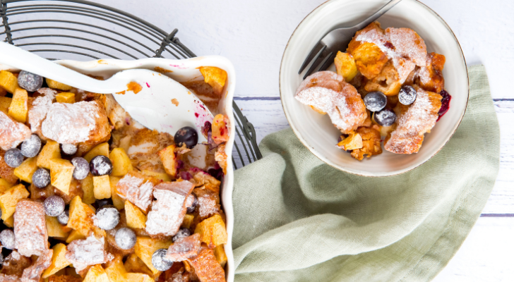 4. A kenyérkeveréket egy sütőedénybe kanalazzuk, és a cukros kenyérpudingot kb. 35 percig sütjük 180°C-on (felső és alsó hőfokon).