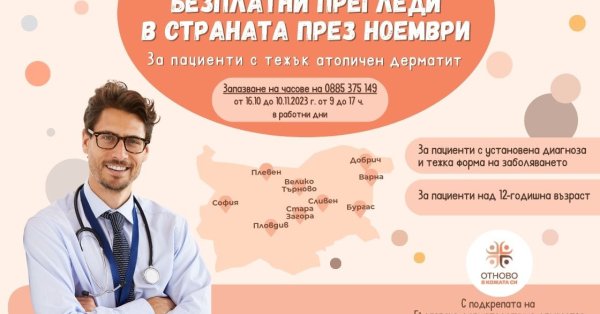 Október 16-tól megkezdődött a súlyos atópiás dermatitisz ingyenes vizsgálatára való regisztráció a 0885 375 149-es telefonszámon, minden hétköznap 9 és 17 óra között A kezdeményezésben az ország kilenc városának vezető bőrgyógyászai vesznek részt – Szófia, Sliven, Stara Zagora, Plovdiv, Pleven, Dobrich, Várna, Veliko Tarnovo és Burgasz. A megtekintésekre egész november hónapban kerül sor, és november 10-ig lehet időpontot foglalni.