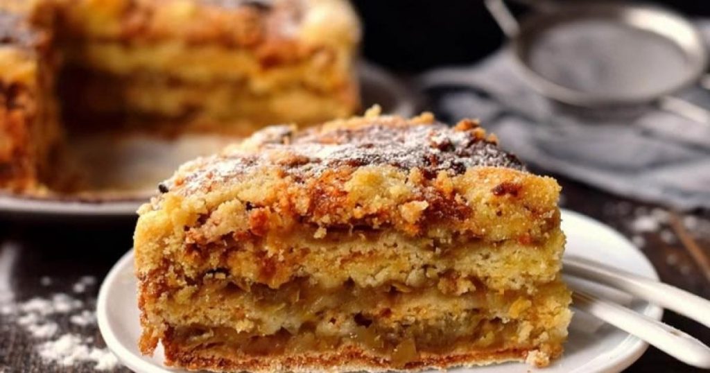 - Hasonlóképpen formáljunk négy réteg laza tésztát és három réteg almatölteléket.