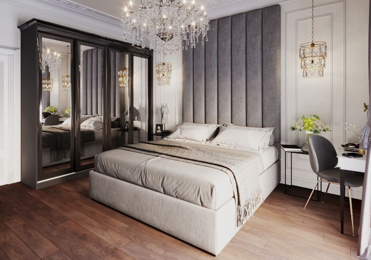 A legfontosabb dolog az, hogy ne adja fel a szürke árnyalatot. Ebből a készletből a fekete vagy a fehér elhagyható, de a szürke kihagyásával a hálószoba „foltos” lesz, amitől hullámos lesz a falakra nézve.