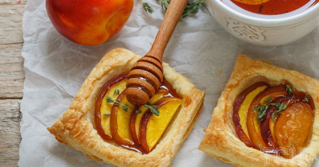 Tegyünk egy evőkanál kecskesajtot minden leveles tészta négyzet közepére, és kenjük egyenletes rétegre. A kecskesajt tetejére néhány szelet lilahagymát teszünk, majd barack szeletekkel. Frissen őrölt fekete borssal ízesítjük a tartleteket.