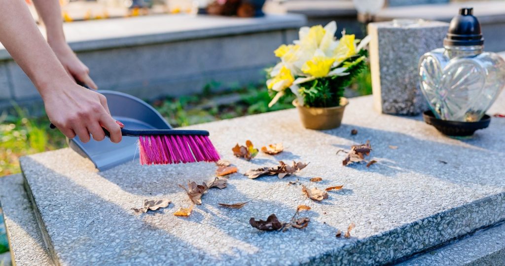 A sírkő megtisztítása mindig Kezdje azzal, hogy eltávolítja a lágy kefével vagy szivacsokkal, amelyek minden laza szennyeződést halmoztak fel, például: a fákból esett levelek, ágakat, tűk vagy szárított paraffint gyertyákból. Legyen óvatos azonban olyan durva vezetékekkel, amelyek megkarcolhatják a felületeket.