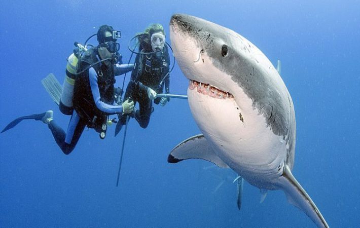 A speciális ketrecekben lévő búvárok a vízbe merülnek, ahol nagy fehér cápákkal kerülnek kapcsolatba.