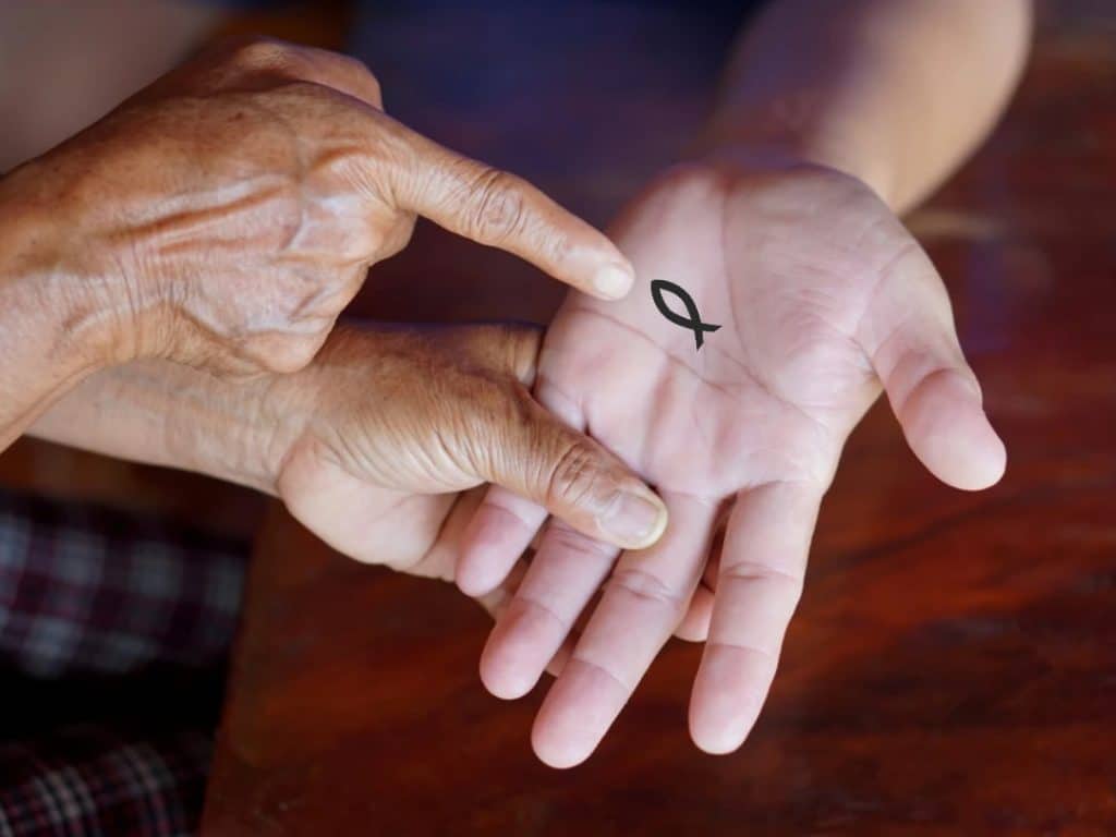 A kézen lévő hal szimbólumot két ívelt vonal alkothatja, amelyek az egyik végén metszik egymást, és farkat alkotnak. Ez a jel két egymást átfedő háromszögből is kialakítható. Egy vagy több ilyen szimbólumot láthat a kezén.