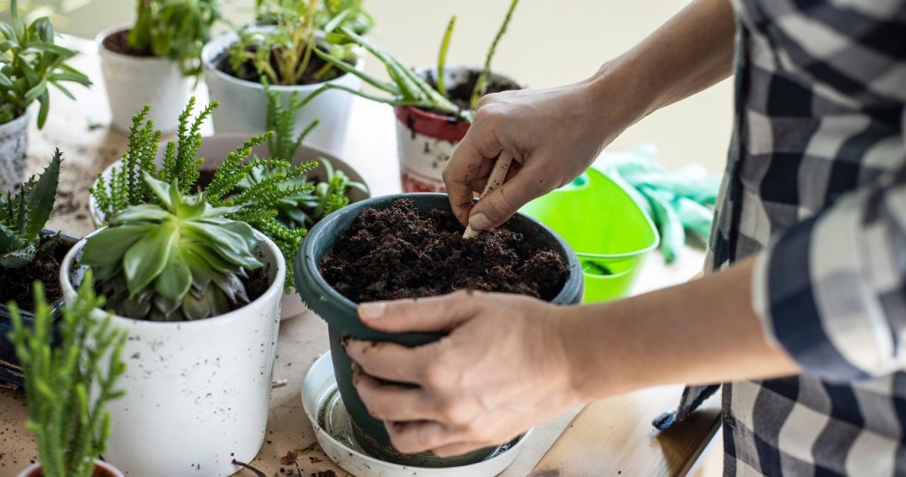 Ezután beleöntjük a talajt, amelynek enyhén savasnak, termékenynek, áteresztőnek és humuszban gazdagnak kell lennie. Ehhez használhatjuk a po-t egyetemes virágot, amit perlittel, homokkal vagy érett komposzttal keverünk.