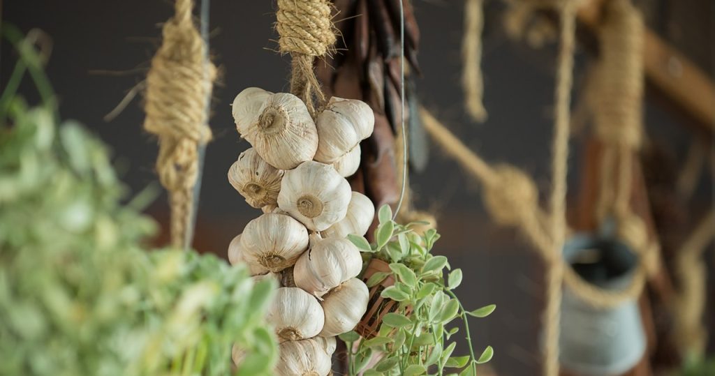 Hihetetlenül egyszerű a fokhagyma lógása az erkélyen. Csak kösse össze néhány fejet egy szálral vagy egy húrral–