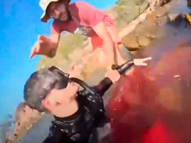 A videón látható, ahogy Matteo kétségbeesetten próbál a partra úszni, miközben a víz körülötte kipirosodik. A parton volt a mentős és a búvároktató, Tommaso Agosti, aki nyomást gyakorolt Matteo sérült lábára, hogy elállítsa a vérzést.