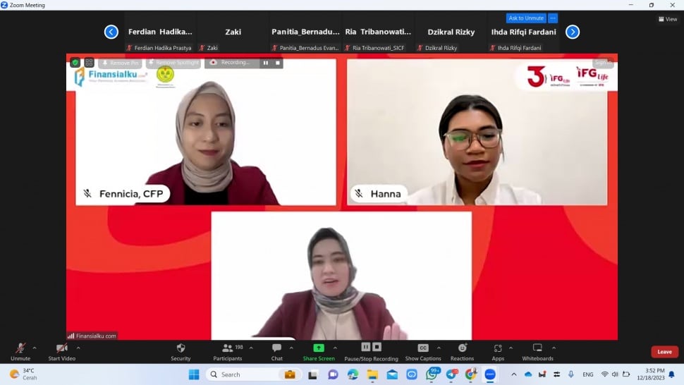 Fennicia, a CFP (Financial Planner Finansialku.com) és Rika Adrika NLP Prac, a PCC (az IFG Life képzési és fejlesztési vezetője) is jelen volt ezen az eseményen. Mindketten arra kérik a résztvevőket, hogy értékeljék pénzügyeiket, és tervezzenek olyan megoldásokat, amelyek 2024-ben a legjobb védelmet nyújthatják.