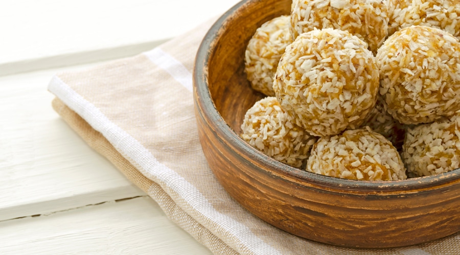 Adjuk hozzá a mazsolát és egy csipetnyi durva tengeri sót, és jól keverjük össze. Ping-pong labda méretű golyókat formázunk, majd kókuszreszelőn megforgatjuk.